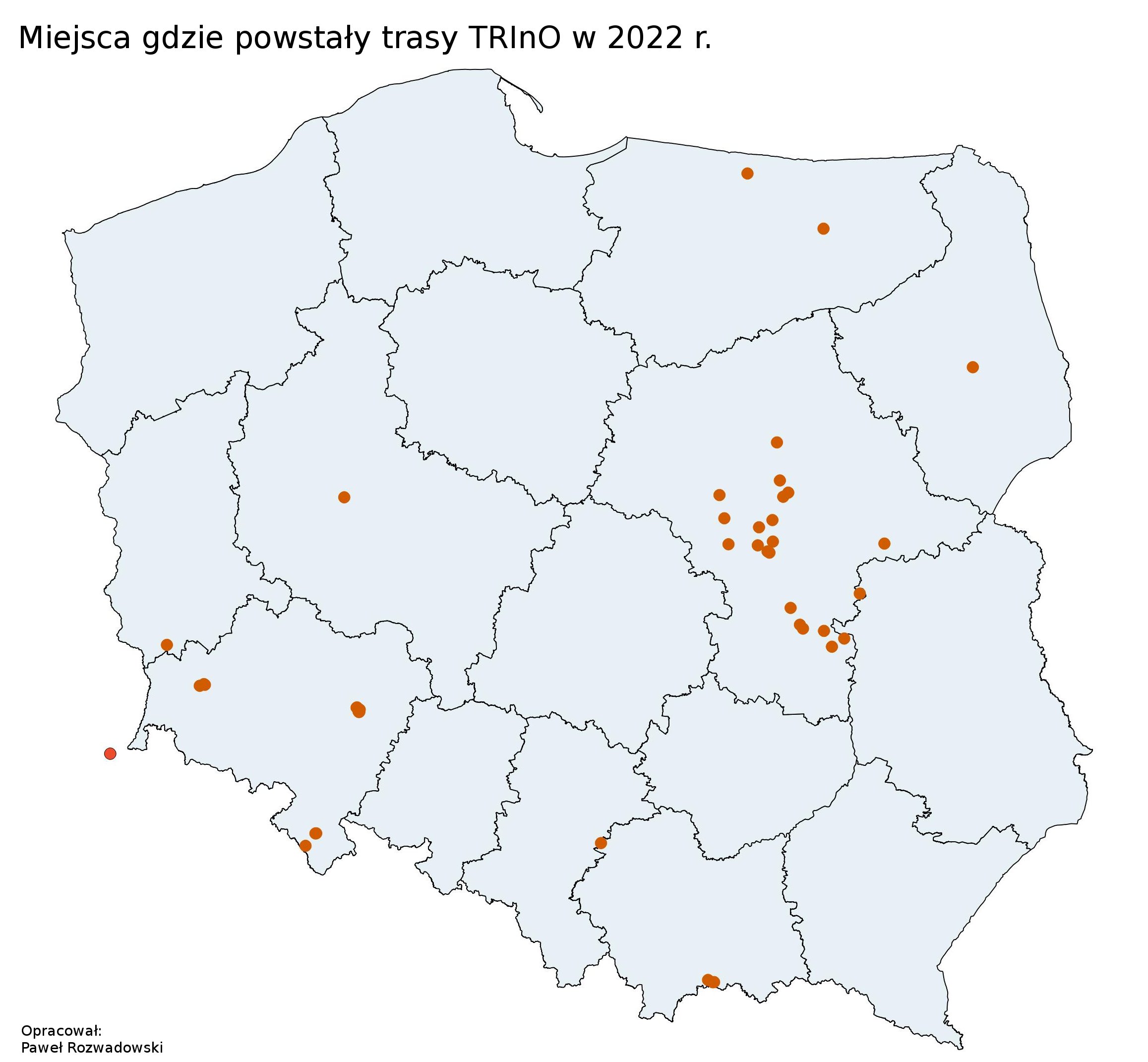Rozpoczął się rok 2023 czas zatem na małe statystyki. Na koniec 2022 roku w naszej bazie jest 853 tras TRInO. W ubiegłym roku opracowano 46 nowych tras: 43 w Polsce, 1 w Czechach, 1 w Portugalii, 1 okazjonalna. W Polsce powstały trasy w 8 województwach, a najwięcej w mazowieckim (21 tras), a dalej kolejno w dolnośląskim (14 tras) i w małopolskim (3 trasy). Najkrótsza trasa (550 m) prowadziła wokół rynku w Bartoszycach, natomiast najdłuższa (66 km), dedykowana dla rowerzystów, wiodła wzdłuż zółtego szlaku wokół Bolesławca.