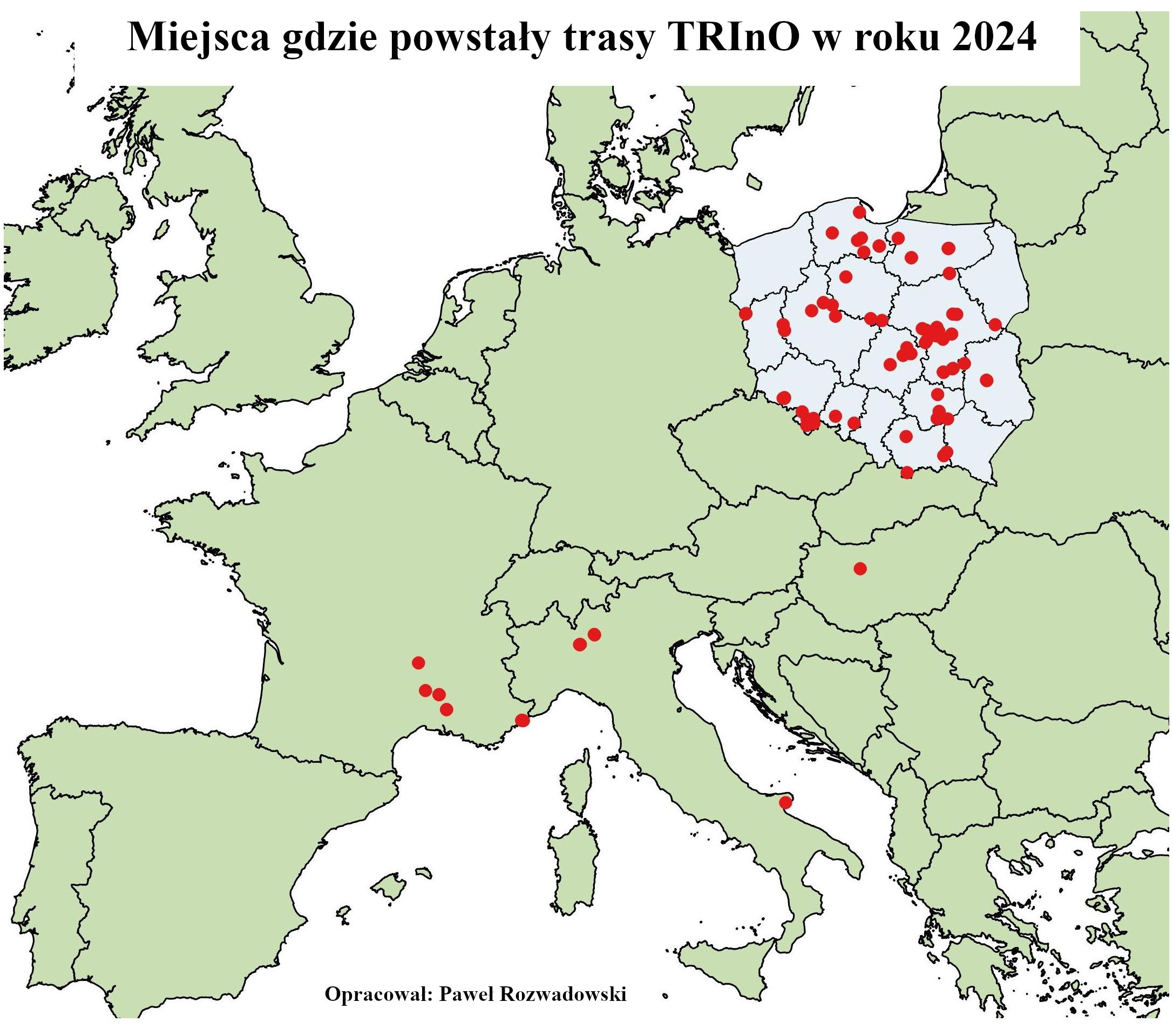 Rozpoczął się rok 2025 czas zatem na małe statystyki. Na koniec 2024 roku w naszej bazie jest już ponad 1000 tras TRInO. W ubiegłym roku opracowano 105 nowych tras: 89 w Polsce, 9 we Francji, 6 we Włoszech oraz jedna na Węgrzech. W Polsce powstały trasy w 13 województwach, a najwięcej w mazowieckim (35 tras), a dalej kolejno w dolnośląskim (10 tras) i w pomorskin (7 tras). Najkrótsza trasa (300 m) prowadziła w Warszawie na Chomiczówce wokół kaplicy-panteonu PTTK, natomiast najdłuższa (45km), nad rzeką Wełną wiodła z Wągrowca do Janowca Wielkopolskiego.