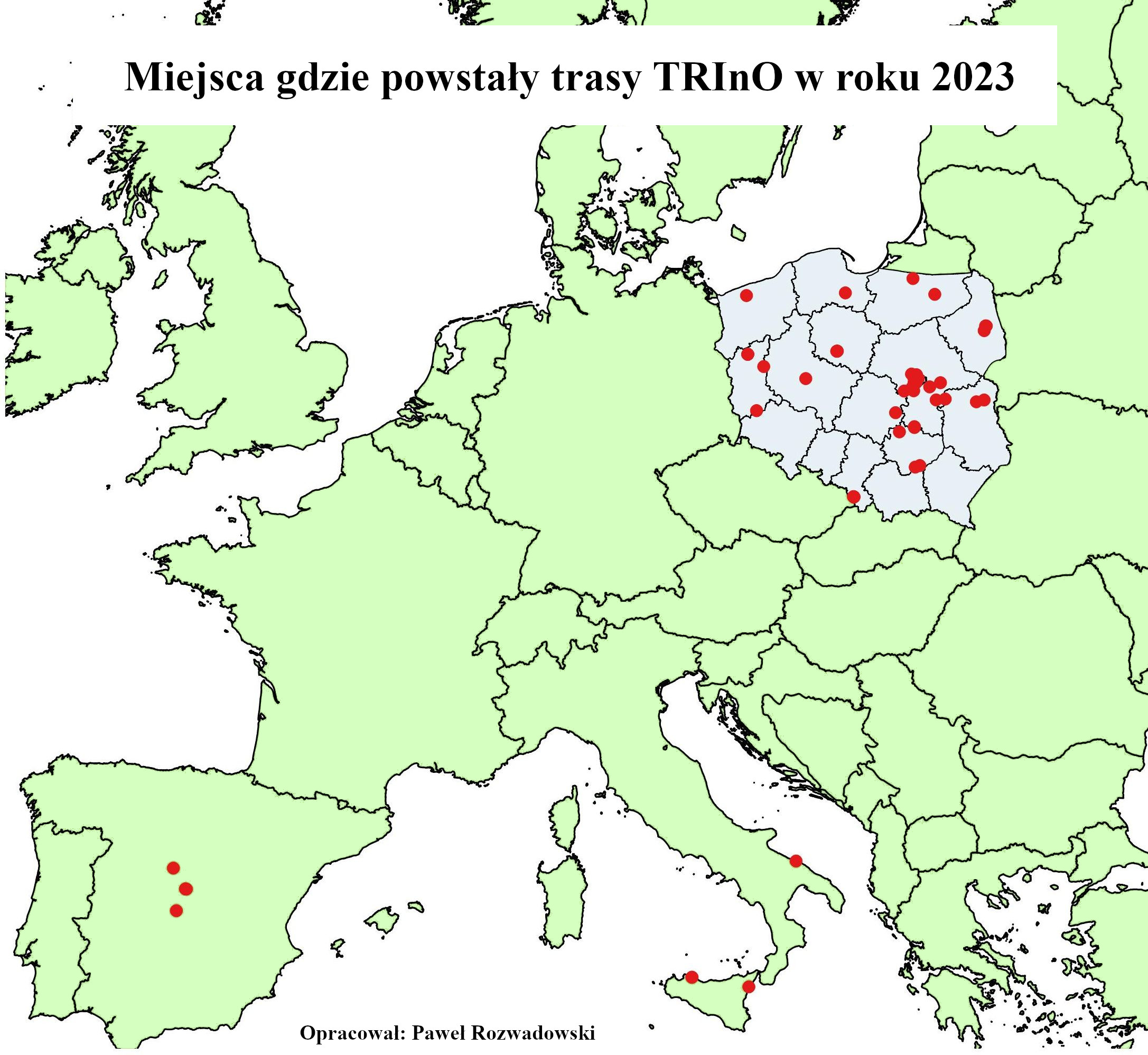 Rozpoczął się rok 2024 czas zatem na małe statystyki. Na koniec 2023 roku w naszej bazie jest 901 tras TRInO. W ubiegłym roku opracowano 51 nowych tras: 43 w Polsce, 4 w Hiszpanii, 4 we Włoszech. W Polsce powstały trasy w 13 województwach, a najwięcej w mazowieckim (19 tras), a dalej kolejno w lubuskim (5 tras) i w śląskim (4 trasy). Najkrótsza trasa (400 m) prowadziła w Bari(Włochy) wokół bazyliki św. Mikołaja, natomiast najdłuższa (7,3 km), wiodła ze Starych Babic do Warszawy śladami Transatlantyckiej Radiostacji.